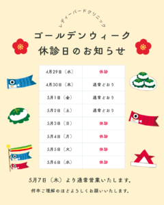 ゴールデンウイークは暦どおりに、5月4日(月)、5日(火)が休診となります。